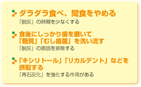 そこで、日常生活でむし歯を防ぐには次の3つが非常に有効です。