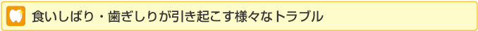人は誰でも力を入れるときに歯を食いしばります。こうした一時的な食いしばりはさほど大きな問題にはなりません。しかし、力を入れる必要のない日常の何気ない場面で、無意識のうちに歯を食いしばったり、睡眠中はもちろん、日中も歯ぎしりをしてしまっている方がいらっしゃいます。これらはお口のなかに様々な問題を引き起こします。