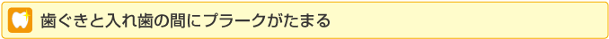 入れ歯は取り外しが可能になっているため、どんなに精密に製作しても、使用していると歯ぐきと入れ歯の間に隙間が生まれます。そこにプラークがたまりやすくなります。